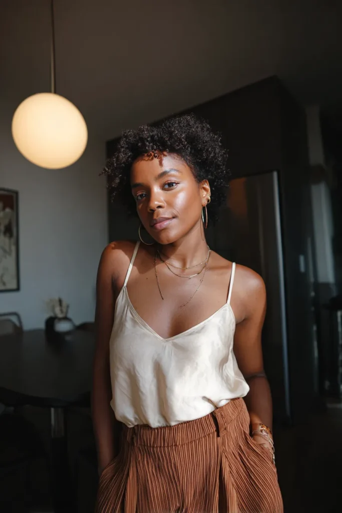 I am really into outfits like this because they feel comfortable but still intentional. The silky top instantly elevates the look, and the warm tones feel flattering on deeper skin tones. It is the kind of outfit I would wear when I want to feel cute without overthinking it.