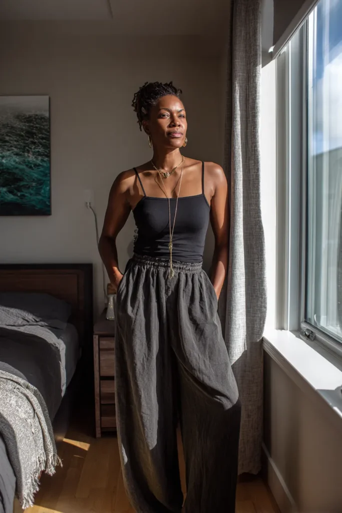 This outfit combines a simple black strap top with loose high waisted trousers that drape beautifully. The overall look feels calm and airy, with soft fabrics that move naturally. It is minimal but still very stylish, perfect for a modern dinner setting.
