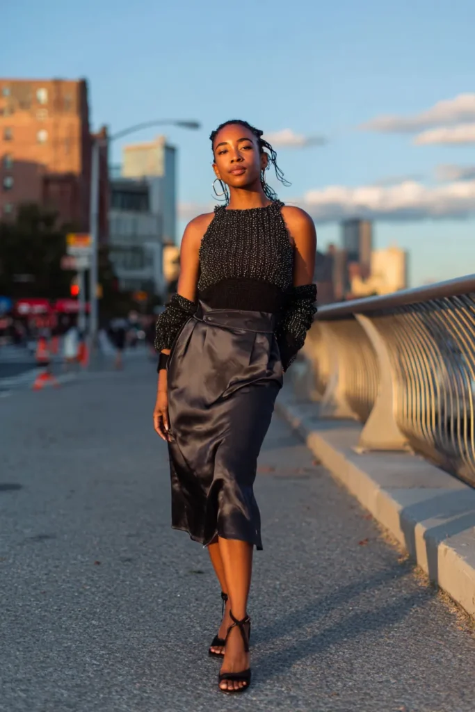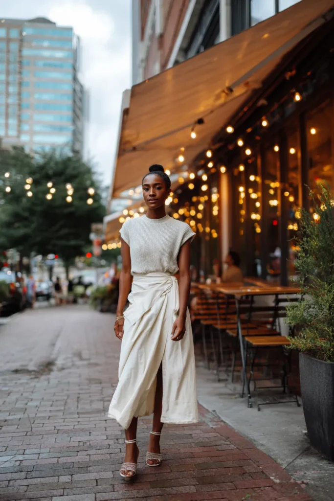 This look combines a sleeveless top with a high waisted satin style skirt that catches the light in the best way. The mix of matte and sheen adds depth, while the midi length keeps it classy and dinner appropriate. Simple heels and a confident posture finish the look with a fresh city vibe.