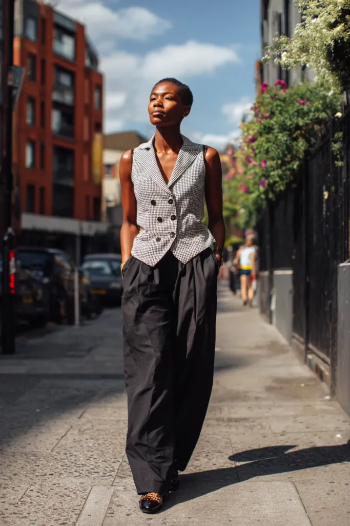 This outfit pairs a sleeveless vest style top with loose black trousers for a cool and modern dinner look. The tailoring feels clean, while the relaxed fit keeps it approachable. It has that effortless city energy that feels very now.