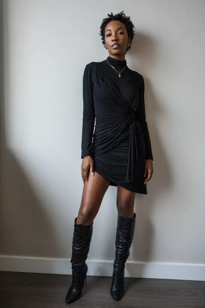 This look features a fitted black mini dress with subtle ruching that adds texture and shape. Paired with knee high boots, it feels bold and fashion forward while still dinner appropriate. The long sleeves balance the shorter length perfectly.
