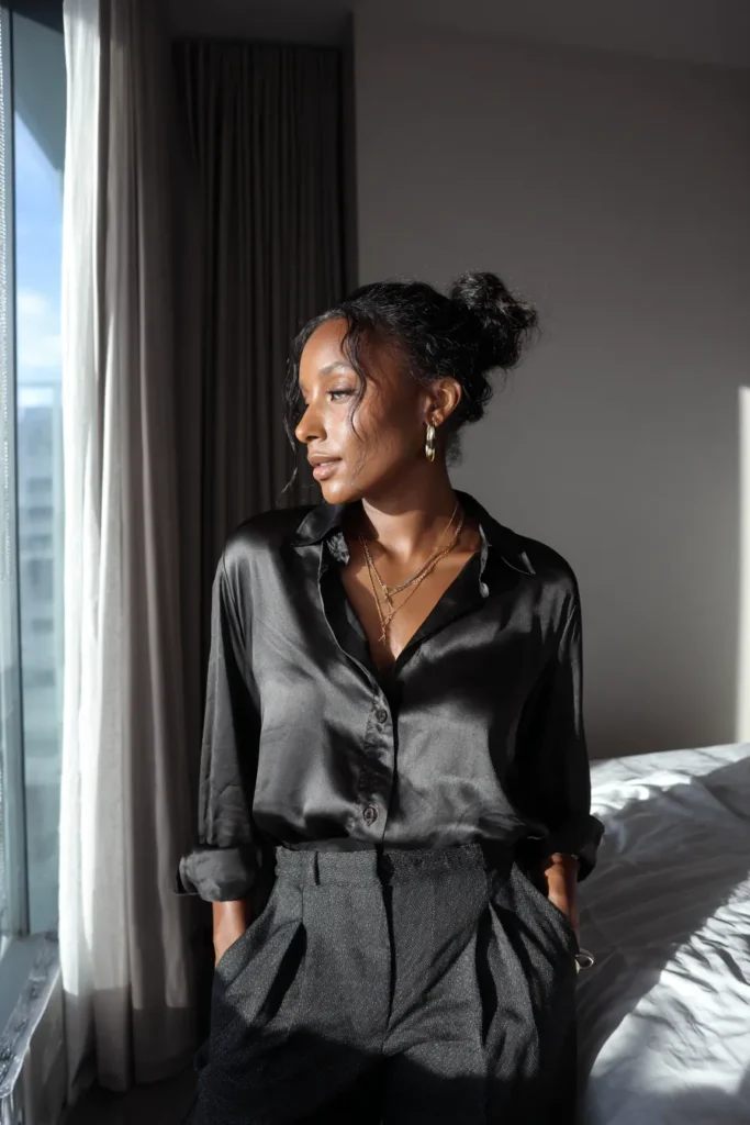 This outfit showcases a satin black button down top tucked into trousers with a soft cinched waist. The sheen of the fabric adds a touch of elegance, while the relaxed fit keeps it modern. It feels polished but not stiff.