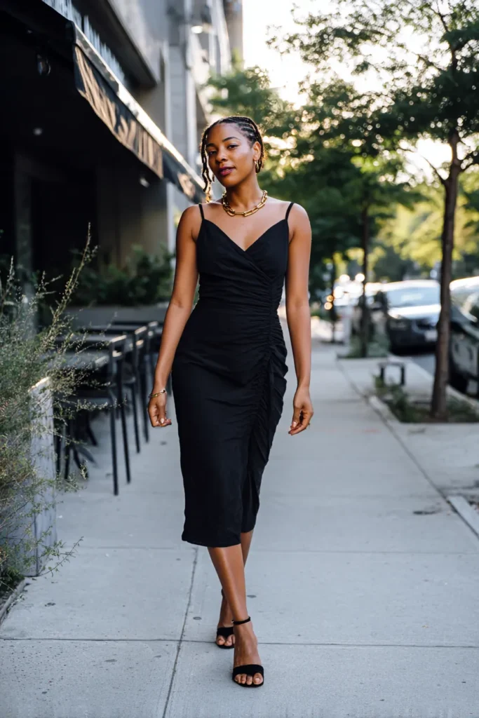 This look features a fitted black midi dress with thin straps and a clean neckline that feels timeless yet modern. The fabric hugs the body without looking tight, and the length hits just below the knee for a polished dinner ready vibe. Simple heels and understated jewelry keep everything sharp and intentional while letting the silhouette do the talking.