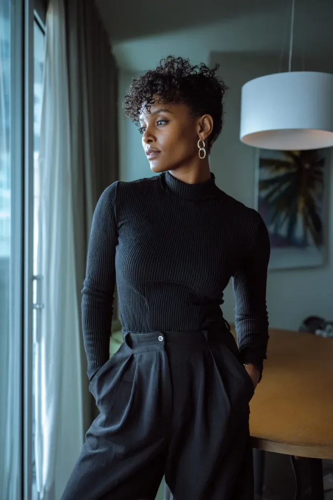 This outfit features a fitted high neck black top tucked into structured trousers with a cinched waist detail. The clean lines and tailored shape give it a strong modern feel, while the all black palette keeps it sleek and refined. It feels fashion forward without looking overstyled.
