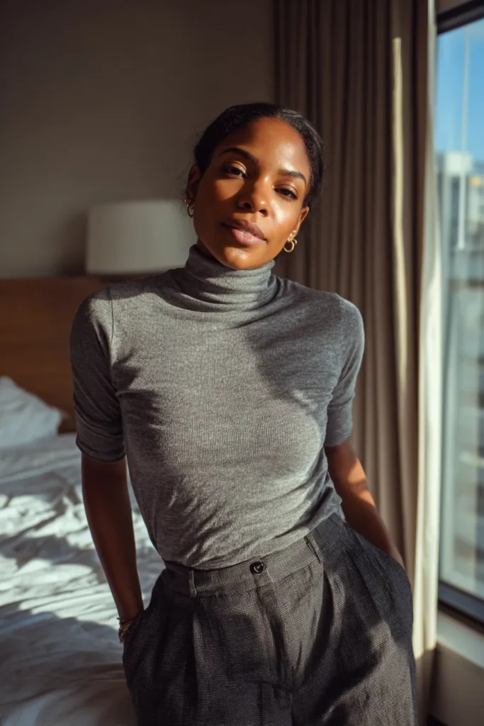 This outfit combines a fitted gray turtleneck with high waisted trousers for a clean and modern dinner look. The soft fabric hugs the body just enough, while the relaxed pants balance everything out. Natural light and simple styling give it that effortless cozy chic feel.
