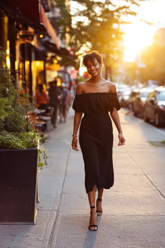 This look features a soft off shoulder black dress with a midi length that moves beautifully while walking. The fabric looks lightweight and relaxed, giving it an easy dinner feel, while the neckline adds just enough drama. Paired with simple heels, it feels perfect for an evening stroll to a cozy restaurant.