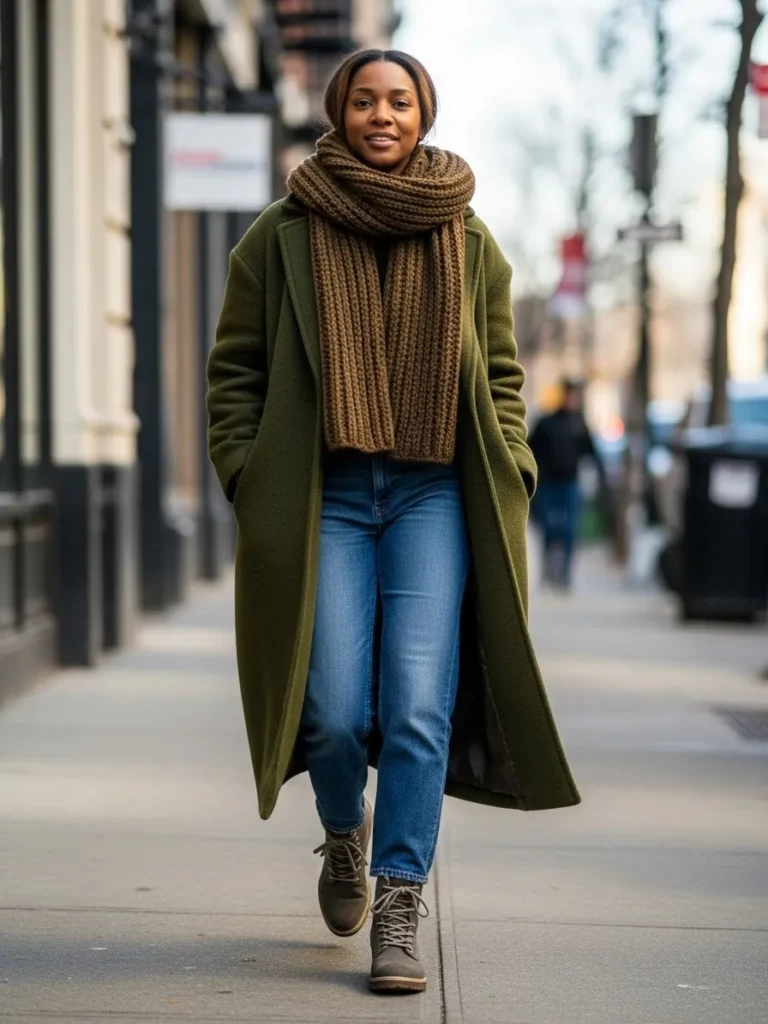 This outfit is all about warmth and comfort. A long olive coat is layered over denim, finished with lace-up boots and a chunky knitted scarf wrapped snugly around the neck. The textures add depth while keeping the look practical.