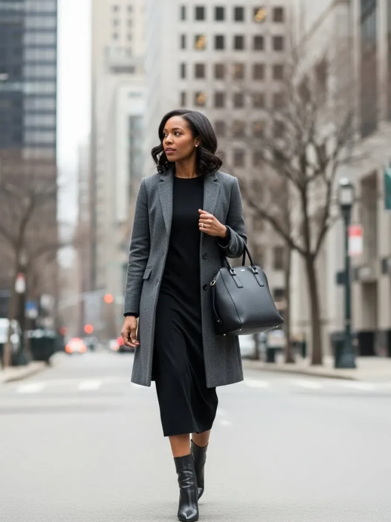 This outfit feels sleek and effortlessly polished. A simple black midi dress is layered with a tailored gray coat that adds structure and warmth. Black ankle boots and a structured handbag keep the look sharp and refined, perfect for city streets and cooler days.