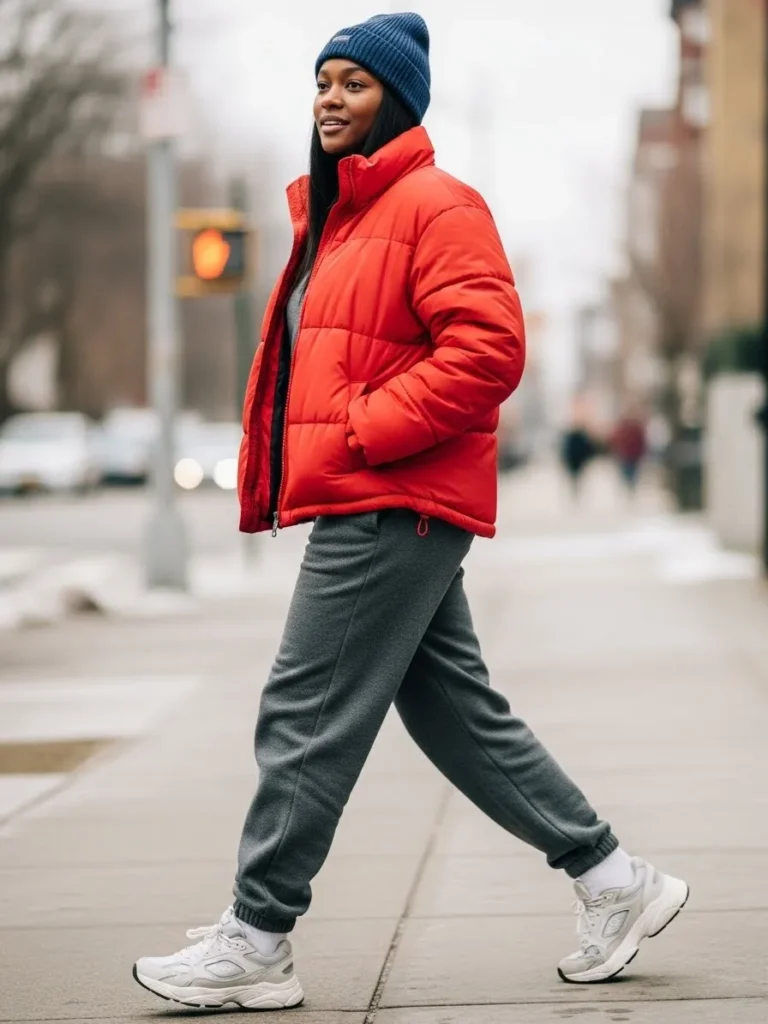 This look is all about cozy comfort with personality. A bright red puffer jacket instantly stands out against soft gray joggers and chunky white sneakers. A knit beanie completes the outfit, keeping it casual, warm, and street-ready.