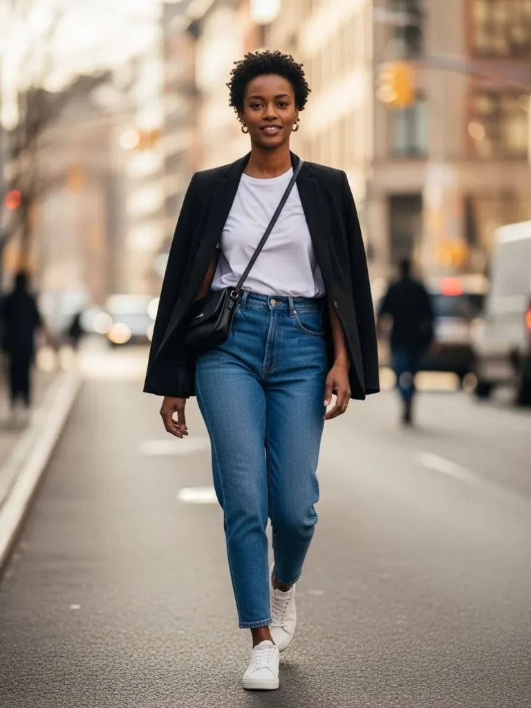 This outfit nails that relaxed but put-together vibe. A crisp white t-shirt is tucked into classic blue jeans and topped with a black blazer for a clean finish. White sneakers and a crossbody bag keep it modern and easy.