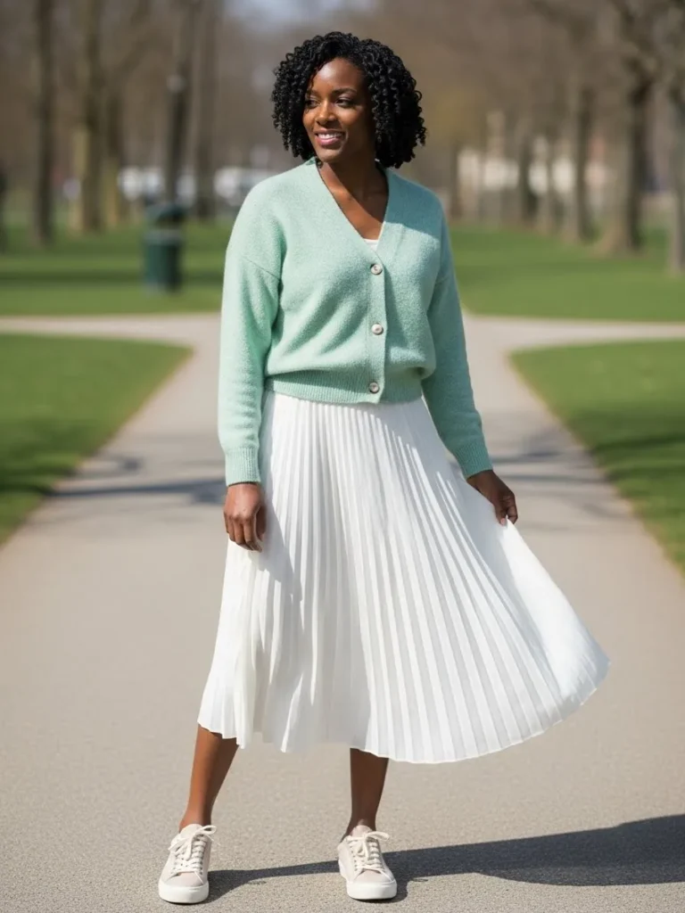 This outfit feels light, feminine, and perfect for sunny days. A soft mint cardigan pairs beautifully with a flowing white pleated midi skirt. White sneakers add comfort and give the look a fresh, modern twist.