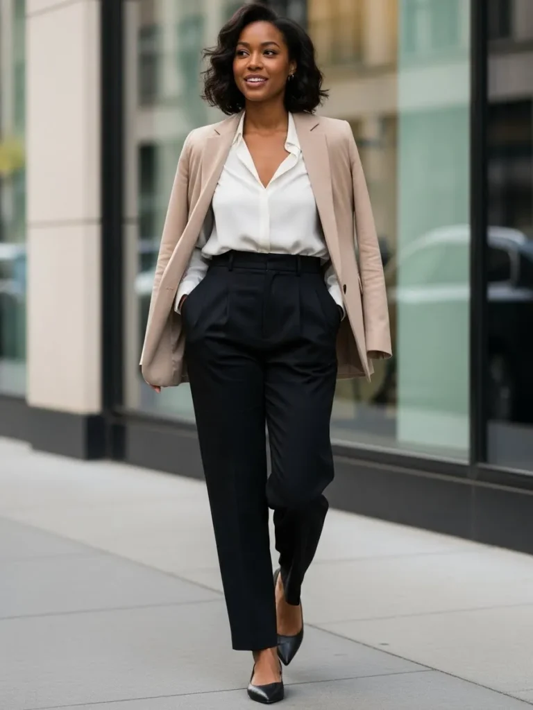 This outfit is clean, confident, and modern. A crisp white blouse is tucked into tailored black trousers and layered with a beige blazer that sharpens the whole look. Classic black heels finish it off, giving it a strong yet elegant city feel.
