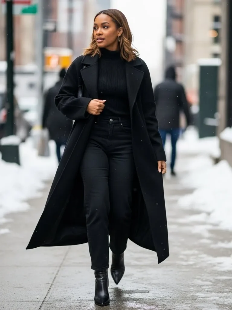 This outfit is sleek and effortlessly cool. A black knit top pairs with fitted black jeans and a long black coat that flows as you walk. Black ankle boots finish the look, keeping it streamlined and powerful for winter streets.