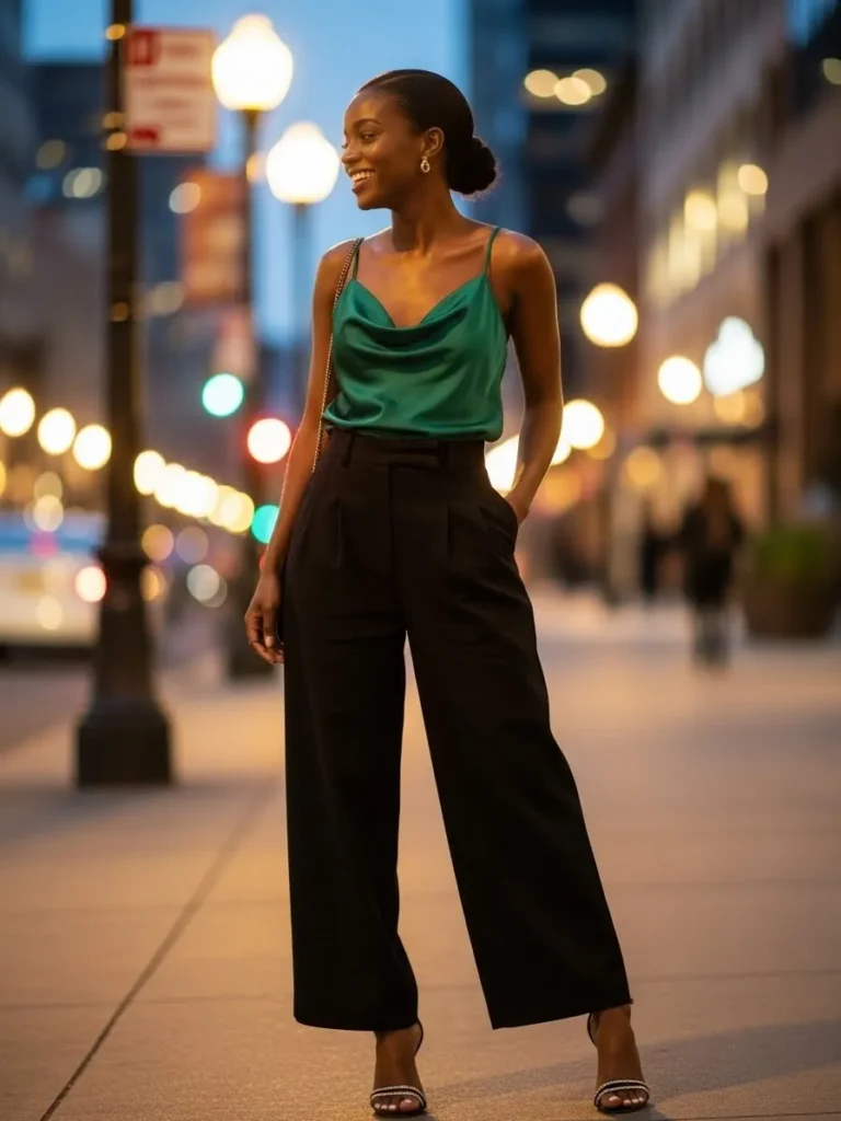 This outfit is sleek and eye-catching after dark. A silky emerald green camisole is tucked into high-waisted black wide-leg trousers, paired with strappy heels. Minimal accessories and a smooth hairstyle keep everything refined and balanced.