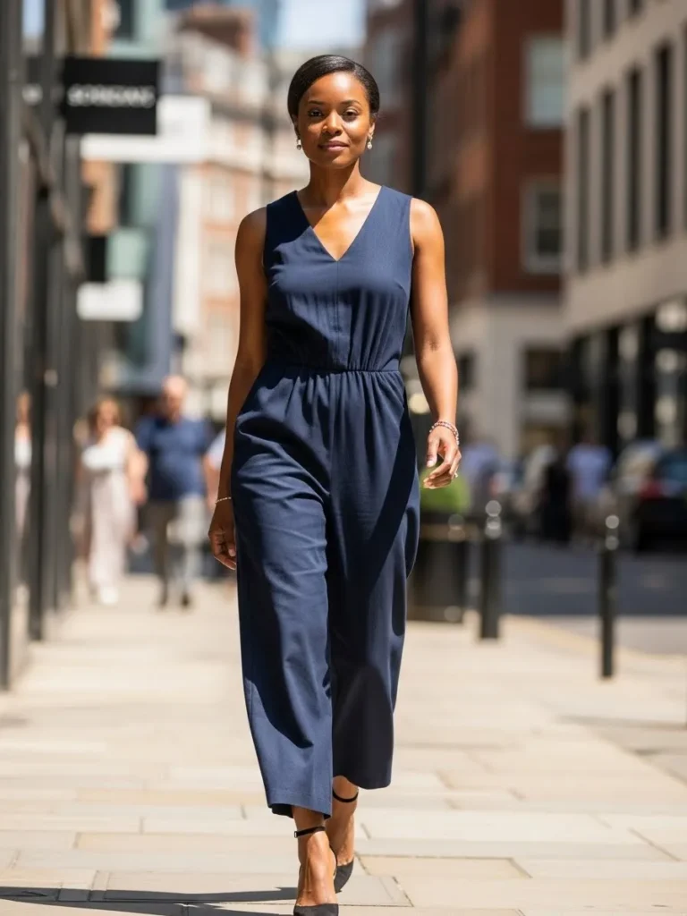 This navy jumpsuit is simple and sophisticated. The sleeveless cut and cinched waist create a flattering shape, while the wide-leg silhouette keeps it comfortable and elegant. Black ankle-trap heels complete the look with a clean finish.