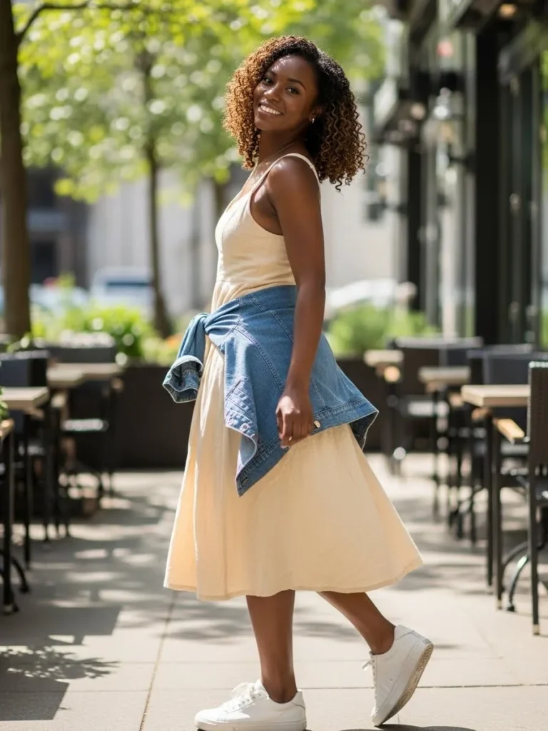 This outfit feels light, playful, and perfect for warm days. A soft beige sleeveless midi dress flows easily while a denim jacket tied at the waist adds a relaxed touch. White sneakers keep everything comfortable and fresh, making the whole look feel effortless and city-ready.
