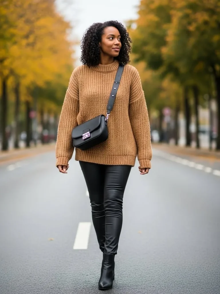 This look leans into cozy textures and clean lines. A chunky brown knit sweater pairs beautifully with sleek black leather pants, finished with ankle boots and a crossbody bag. The colors feel warm and grounded, perfect for crisp fall days.