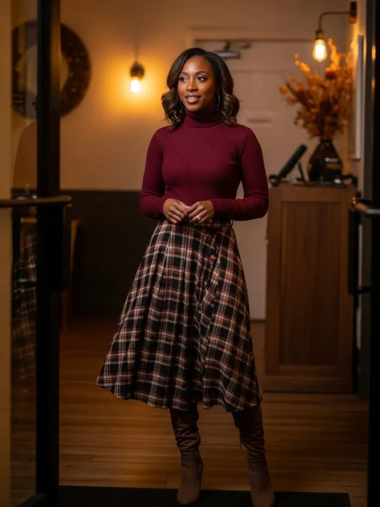 This outfit blends classic and cozy perfectly. A fitted burgundy turtleneck is tucked into a flowy plaid midi skirt, paired with knee-high boots for a refined finish. The warm tones and soft fabrics create a timeless, seasonal look.
