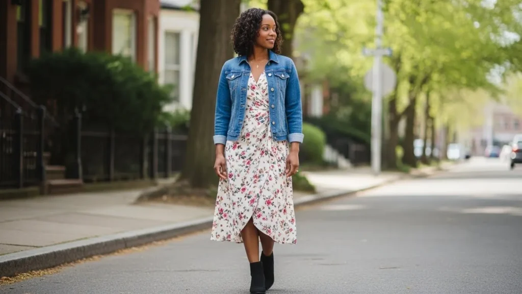 This outfit feels fresh, feminine, and easy. A colorful floral midi dress brings life and movement, while a classic denim jacket adds a relaxed, everyday feel. Light ankle boots keep it comfortable and season-ready.