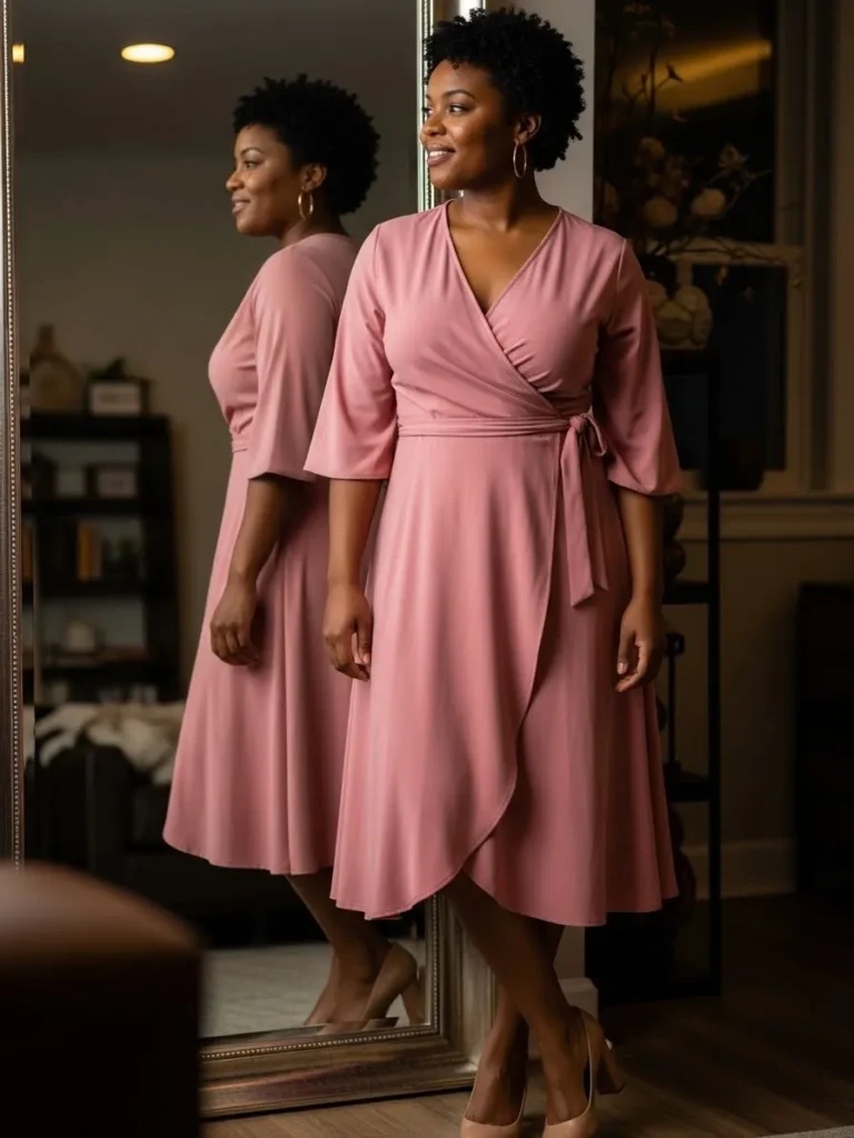 I love how flattering wrap dresses are, especially in soft pink tones like this. The waist detail adds definition without feeling tight, and the color feels warm and confident. This is the kind of outfit that makes getting dressed feel easy and special at the same time.