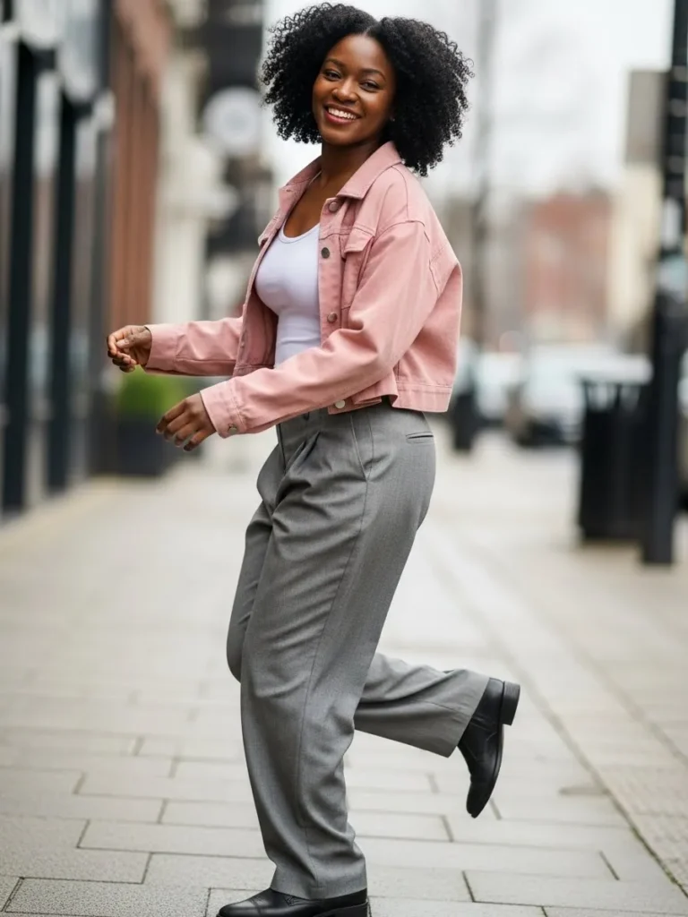 This look features a soft pink cropped jacket layered over a white tank and paired with tailored gray trousers. The cropped length keeps the outfit fresh and modern, while the structured pants add contrast and polish. Black loafers ground the look and keep it wearable for city days.