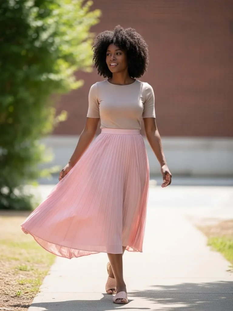 This outfit combines a flowy pleated pink midi skirt with a fitted neutral top for a soft and elegant look. The skirt moves beautifully as you walk, and the light fabric keeps the outfit airy and feminine. Neutral sandals complete the look without overpowering the delicate pink tone.