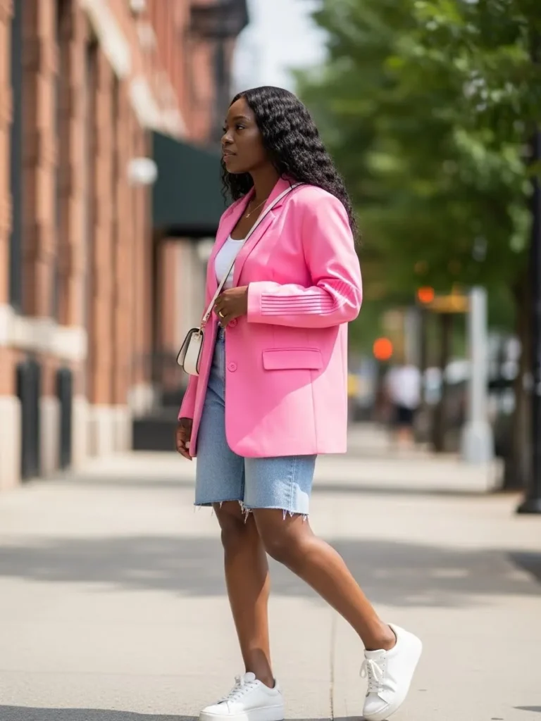 This look pairs a structured pink blazer with a white top and relaxed denim shorts for a fresh street style vibe. White sneakers keep the outfit casual, while the blazer adds structure and confidence. The mix of tailored and laid back pieces feels modern and fun.