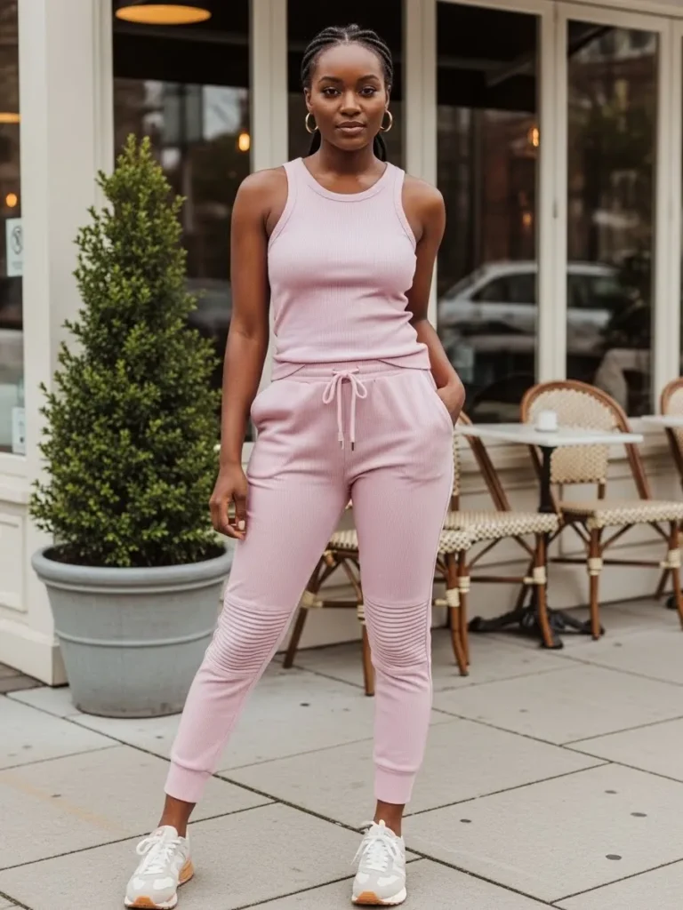 This outfit features a light pink ribbed tank paired with matching joggers for a clean and coordinated lounge look. The fabric looks soft and stretchy, with subtle texture that keeps it from feeling flat. White sneakers add a sporty finish, making the whole outfit feel polished enough for stepping out while still being super comfortable.