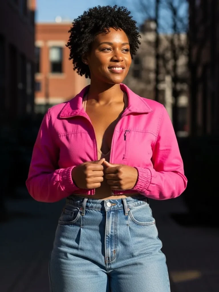This look includes a cropped pink jacket layered over a white tank and paired with high waisted blue jeans. The jacket adds structure and color, while the denim keeps things relaxed and wearable. The overall vibe feels playful, modern, and perfect for everyday city style.