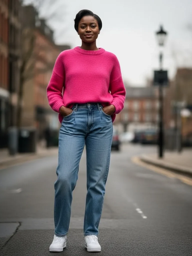 Talk about a pop of color that demands attention. This outfit centers around a chunky fuchsia pink sweater with a slightly oversized fit and a cozy crew neck. The vibrant knit is tucked into a pair of high-waisted medium wash straight leg jeans which creates a beautiful balance between cozy and structured. Finishing the look with crisp white sneakers keeps the vibe youthful and energetic. It is a masterclass in how to take a standard jeans and sweater combo and turn it into a high fashion statement.