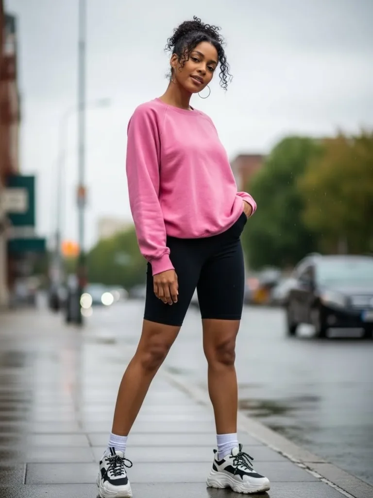 This outfit pairs a soft pink sweatshirt with black biker shorts for a sporty and modern street style look. Chunky sneakers add balance and edge, while the relaxed top keeps everything comfortable. The mix of cozy and athletic pieces feels current and effortless.