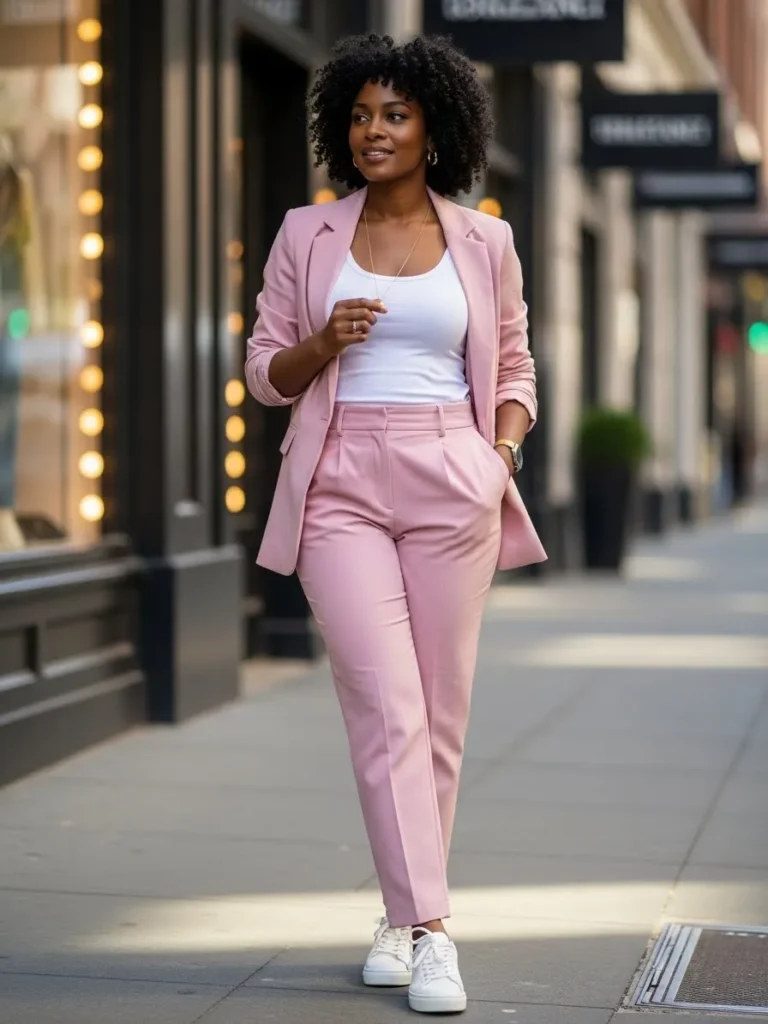 This look features a tailored light pink blazer and matching trousers styled with a fitted white tank and white sneakers. The clean lines of the suit feel polished, while the sneakers keep it approachable and modern. The soft pink color makes the tailoring feel fresh rather than formal.