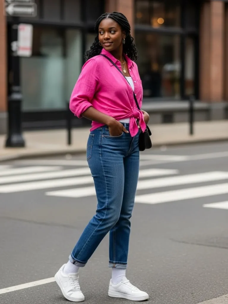 This outfit features a vibrant pink button down shirt tied casually at the waist and paired with classic blue jeans. The fabric looks lightweight and breathable, perfect for everyday wear, while white sneakers keep the look grounded and comfortable. A small crossbody bag and simple jewelry add just enough detail without distracting from the bold pink top.