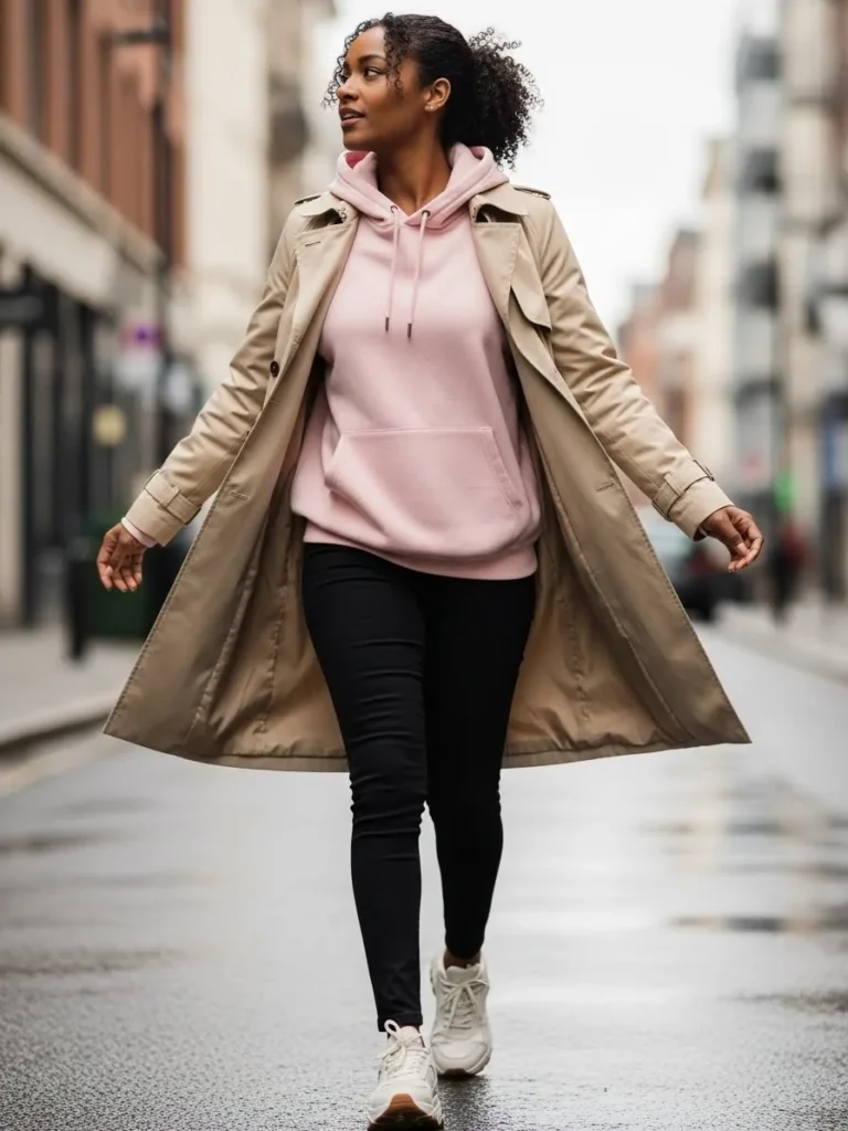 This outfit combines a soft pink hoodie with a beige trench coat and fitted black pants. The layers create a relaxed city look that feels modern and wearable. White sneakers keep everything casual, while the trench adds movement and a polished finish.
