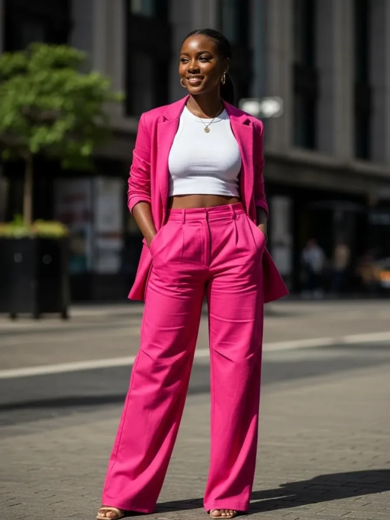 This look features a bold pink blazer and matching wide leg trousers styled with a crisp white cropped top. The tailored fit gives the outfit structure, while the bright pink color makes it impossible to ignore. Minimal accessories and neutral shoes let the suit stay front and center.