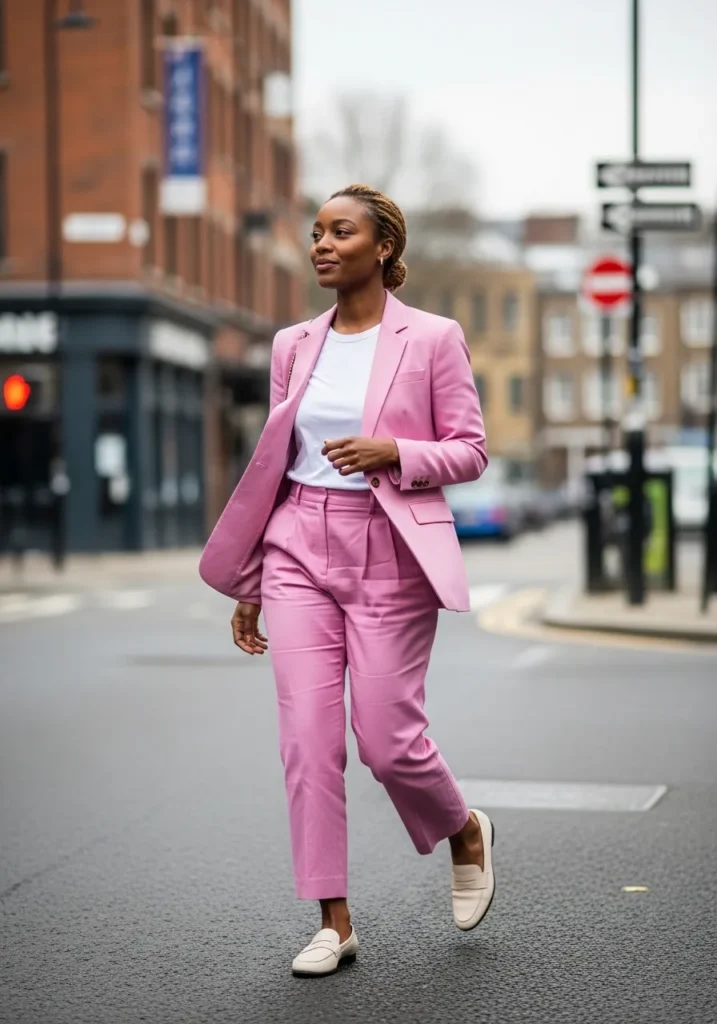 I love suits like this because they feel powerful but still fun. The pink makes it less serious and more approachable. It feels like the perfect balance between dressed up and easygoing.