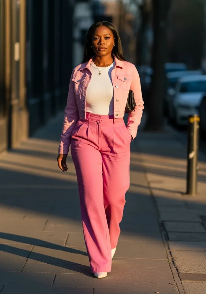 This look pairs a soft pink jacket with matching pink wide leg trousers and a simple top underneath. The tailored pieces feel polished while the relaxed fit keeps it approachable. The monochrome pink makes it feel bold but still wearable.