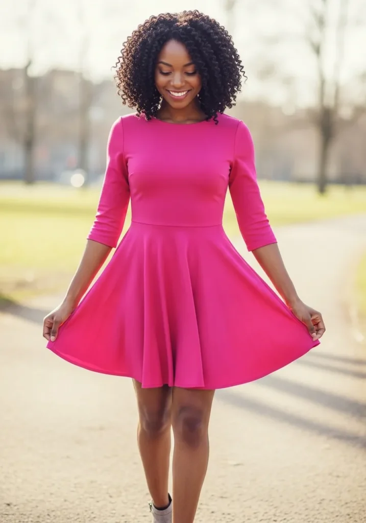 This outfit features a fit and flare pink dress with a defined waist and a softly flared skirt. The fabric looks smooth and structured enough to hold its shape. The bright pink color makes the silhouette pop beautifully.
