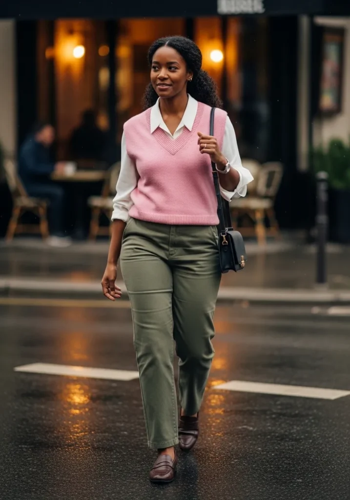 This look pairs a soft pink sweater with olive green utility pants and simple shoes. The sweater brings warmth and color while the pants add a casual edge. The vibe feels modern playful and balanced.