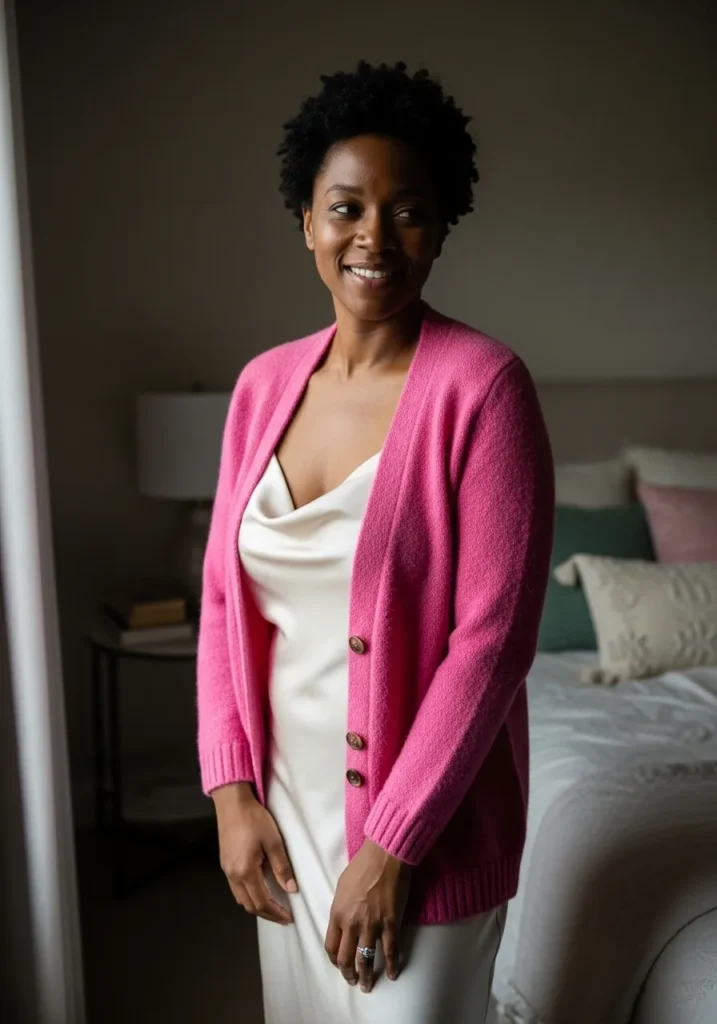 I love cardigans in pink because they feel friendly and easy to style. This look feels relaxed but polished enough for everyday plans. It is playful without trying too hard.