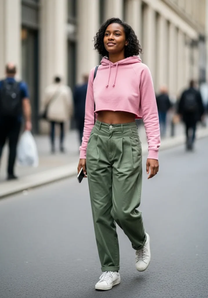 This look pairs a cropped pink hoodie with relaxed cargo pants and sneakers. The hoodie adds fun while the cargo pants keep it grounded and street ready. The contrast feels playful and current.
