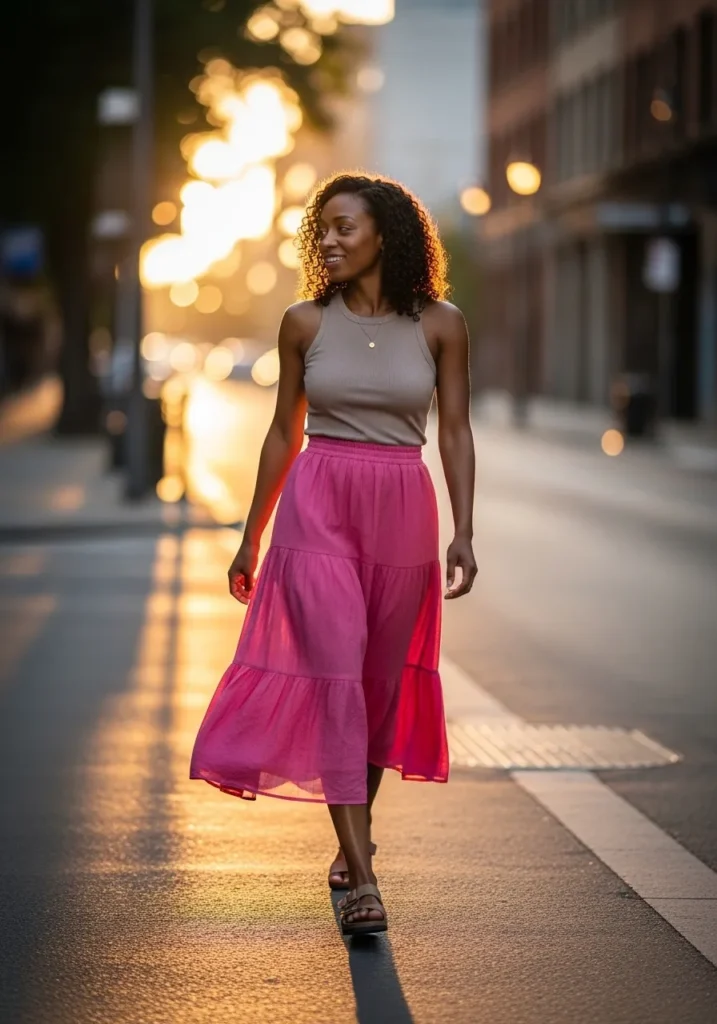 This outfit features a flowing pink midi skirt styled with a simple tank top. The skirt fabric moves beautifully and catches the light as you walk. The look feels airy feminine and playful.