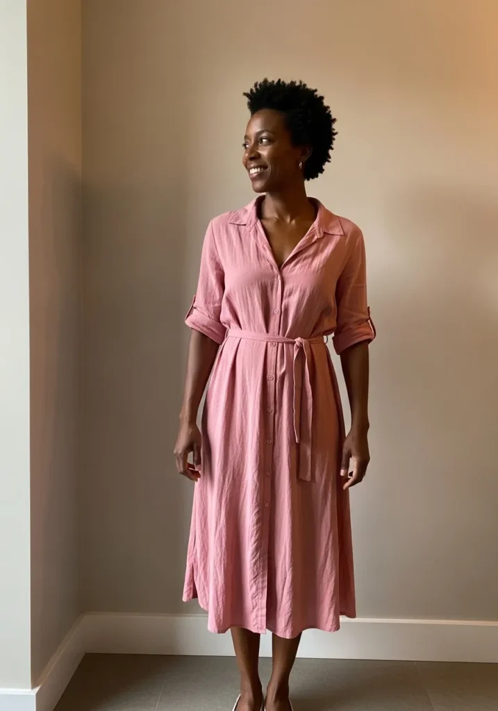 This look showcases a soft pink button front dress with a relaxed fit and gentle drape. The fabric looks breathable and comfortable while the silhouette feels classic and clean. The pink keeps it light and cheerful.
