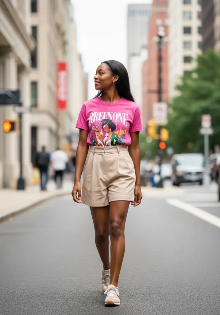 This look pairs a playful pink graphic tee with light neutral shorts and sneakers. The tee brings color and personality while the shorts keep the outfit breezy and relaxed. The overall vibe feels youthful easy and cheerful.
