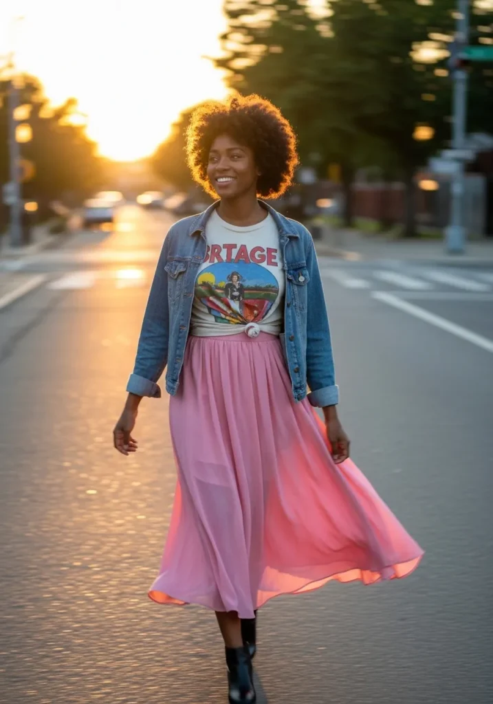 This look pairs a soft flowing pink midi skirt with a casual denim jacket and a graphic tee. The skirt brings movement and color while the denim adds structure and contrast. The overall vibe feels playful relaxed and very wearable.