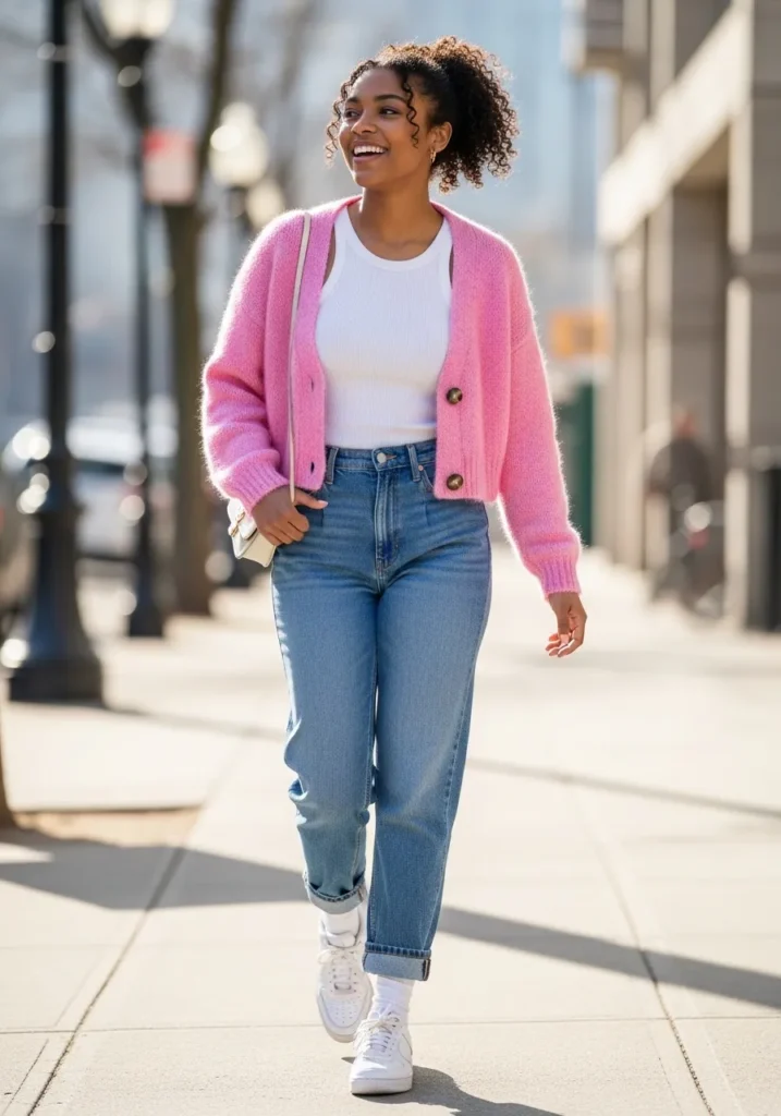 This outfit features a soft pink cardigan layered over a white tee and classic blue jeans. The knit looks cozy and lightweight while the denim grounds the look. The pink adds warmth and softness to a simple everyday outfit.