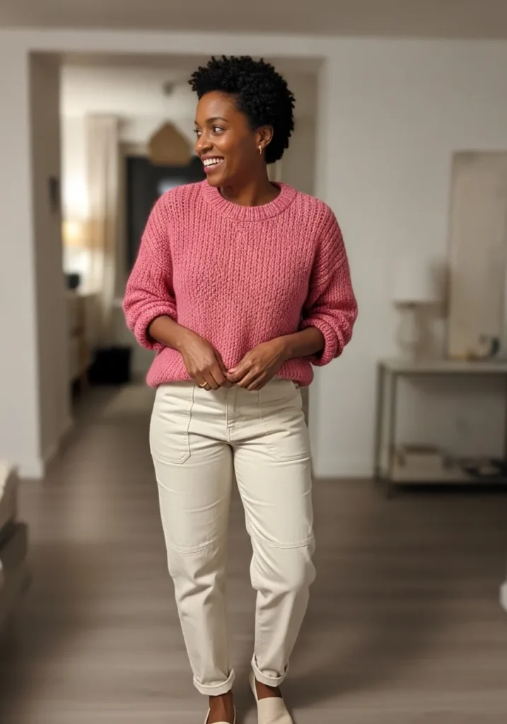 This outfit features a textured pink sweater paired with light colored straight leg pants. The knit looks soft and cozy while the neutral pants keep the look clean and balanced. The vibe feels warm comfortable and effortlessly put together.
