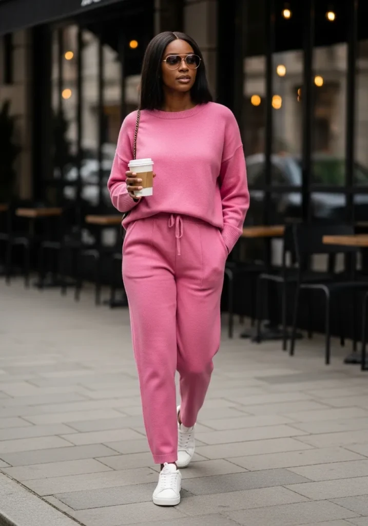 This look is a matching pink sweatshirt and jogger set styled with sneakers. The fabric looks soft and relaxed but the monochrome color makes it feel intentional. The overall look feels sporty playful and neat.
