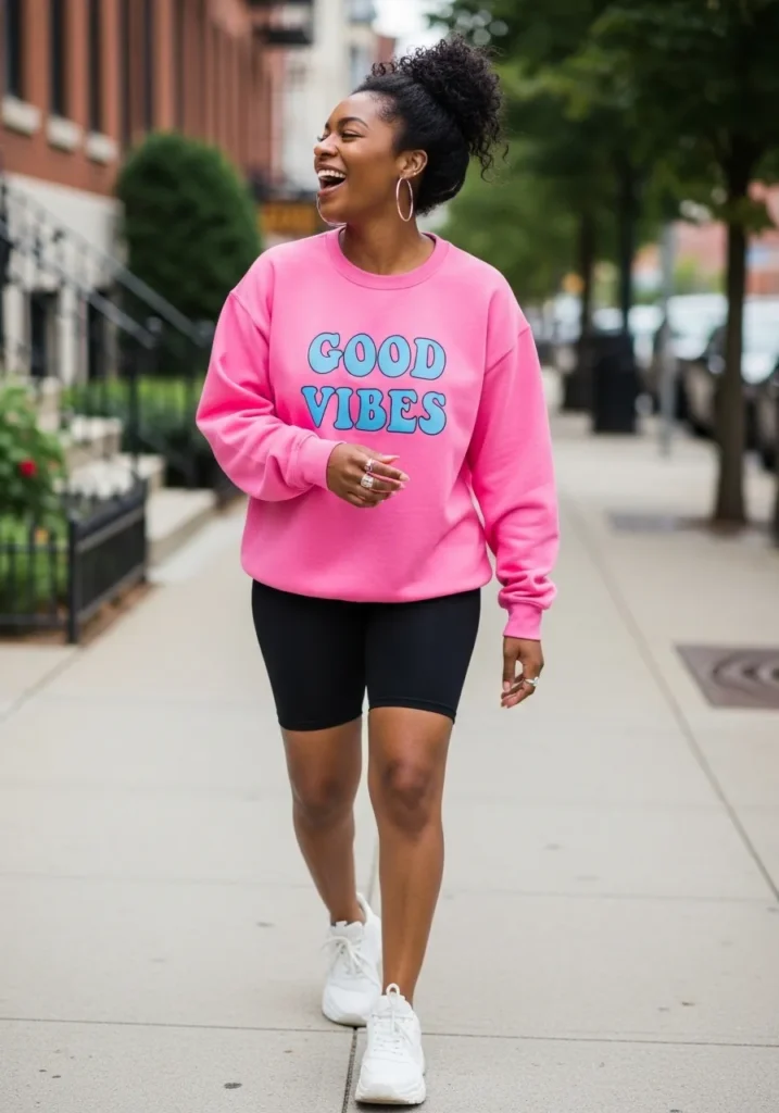 This look pairs a pink graphic sweatshirt with black biker shorts and sneakers. The sweatshirt brings color and personality while the shorts keep it sporty and modern. The vibe feels casual fun and confident.