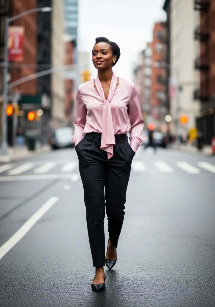 This outfit features a soft pink blouse styled with fitted black pants and classic shoes. The blouse adds softness and color while the dark pants keep it sharp. The overall look feels polished playful and balanced.